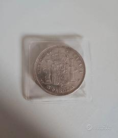 Moneta originale spagnola da 5 Pesetas del 1889, periodo di Alfonso XIII, con stemma reale.