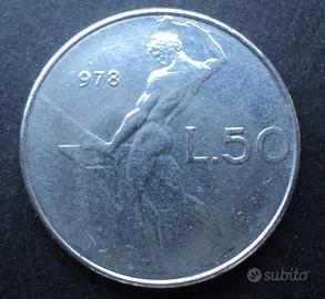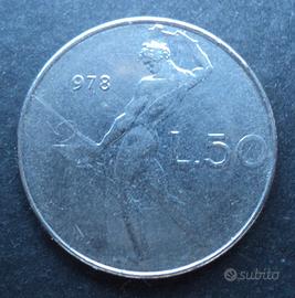 Al Dritto è rappresentata una testa di donna volta verso destra, cinta da una corona d'alloro. In basso un rombo con sottostanti le firme degli autori. Sulla parte esterna la scritta circolare REPUBBLICA ITALIANA, divisa da un punto. Al Verso una raffigurazione di Vulcano intento a battere il ferro su di una incudine mediante un martello. A destra l'indicazione del valore L.50 con sottostante il segno di zecca R, a sinistra il millesimo di conio. Contorno rigato, diametro 24,80 mm, peso 6,25 g, materiale acmonital.