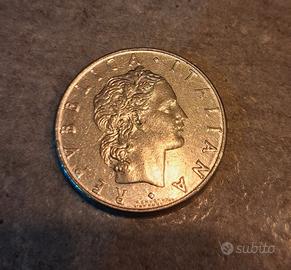 Moneta da 50 lire "Vulcano" della Repubblica Italiana, coniata nel 1977: sul dritto rappresenta il Dio romano 'Vulcano' che batte il ferro su un'incudine, sul retro una donna con una corona di alloro e la scritta 'Repubblica Italiana'.