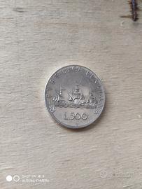 Moneta da 500 lire , in argento con le tre caravelle, da collezione con ritratto della repubblica italiana e al rovescio le tre caravelle in navigazione anno 1958 argento 835/1000.