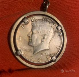 Vendo moneta da mezzo dollaro con testa del presidente John Kennedy del 1964 all’interno di un portachiavi di argento ( vedi foto con simbolo Argento evidenziato con freccia gialla ).