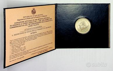 Moneta in argento della Repubblica di San Marino coniata per commemorare i 150 anni dalla nascita di Leone Tolstoj.