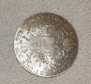 Tallero Maria Teresa 1780, una famosa moneta d'argento utilizzata per il commercio internazionale. Materiale: Argento con una purezza dell'833‰. Peso e Dimensioni: Pesa circa 28,07 grammi e ha un diametro di 40 mm. Riporta la data 1780 (anno della morte dell'imperatrice), ma la moneta è stata coniata per decenni come riconio in diverse zecche, tra cui Vienna, Roma, Londra e Parigi. Stato di conservazione: perfetto Origine: Austria