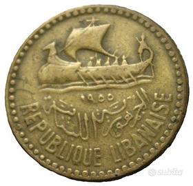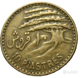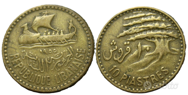 Moneta da 10 Piastre della Repubblica Libanese, coniata nel 1955. Sul dritto è raffigurata una nave fenicia, mentre sul rovescio è presente un albero di cedro.
