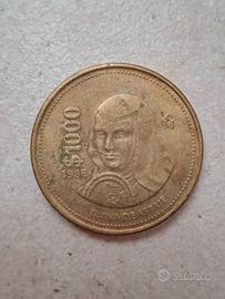 Moneta da 1000 dollari messicani (pesos) del 1988. Di forma rotonda, raffigura l'aquila sul fronte e la poetessa Juana Inés de la Cruz sul retro.