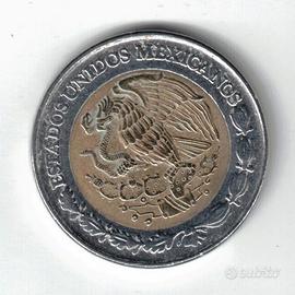 Moneta da 2 Pesos del Messico, coniata nel 1996. La moneta è bimetallica, con un anello esterno e un nucleo interno.