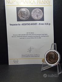 TEMATICA ( AEQVITAS AVGVST- S C ) CHÉ CELEBRA EQUITÀ E LA STABILITÀ ECONOMICA DELL' IMPERATORE VESPASIANO , FIGURA AEQUITAS IN STANTE SUL ROVESCIO CHÉ SORREGGE BILANCIA A SINISTRA E SCETTRO A DESTRA, AL LATI ( S C ) SENATO CONSULTO) .