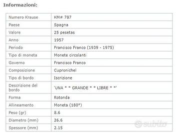 Vendo moneta SPAGNA da 25 Pesetas del 1957 "FRANCISCO FRANCO"