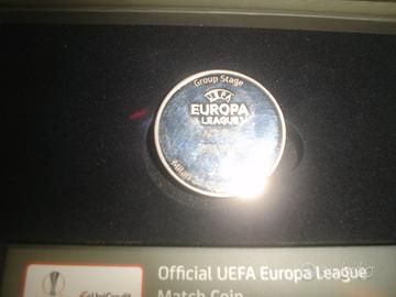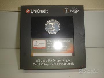 La moneta della partita UEFA viene venduta in una scatola con il logo della UEFA Europa League e UniCredit. Su un lato della stessa medaglia ci sono i dettagli della partita , tra cui le squadre che giocano e la data, e l'altro lato ha i dettagli della competizione .