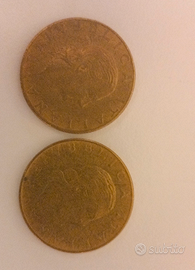 Vendo coppia di monete da 200 Lire della Repubblica Italiana, serie "Lavoro", coniate in Bronzital. Queste monete dorate sono state il simbolo dei telefoni pubblici e della quotidianità italiana per decenni.