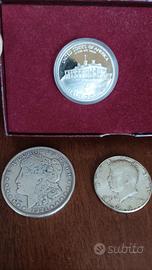3 Monete da collezione in argento 900 1 Dollaro Morgan 1921 peso 26.7 grammi Mezzo dollaro Kennedy 1964 peso 12.5 grammi Mezzo dollaro 1982 fdc proof peso 12.5 grammi Monete autentiche.