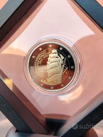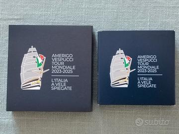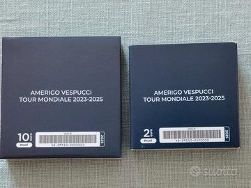 Moneta da 2€ da posizionare al centro della moneta a ciambella. Dritto: Al centro, la raffigurazione della Nave Scuola Amerigo Vespucci che, a vele spiegate, solca le onde del mare. Ad arco, sulla sinistra andando a capo, la scritta “Amerigo Vespucci Tour Mondiale 2023-2025”; In basso sulla sinistra, “2025”, millesimo di coniazione della moneta e “RI”, acronimo della Repubblica Italiana; a destra, “R”, identificativo della Zecca di Roma; in esergo “E. FERRETTI”, firma dell’autore; nel giro, le dodici stelle dell’Unione Europea. Esemplari 10000, materiale interno: nichel e ottone - esterno: rame e nichel diametro 25,75 mm peso 8,5 gr