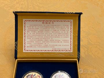Cofanetto commemorativo contenente due monete d’argento che rappresentano il maiale dello zodiaco cinese per l’anno 2007. Edizione limitata. Riporto qui di seguito la traduzione del certificato di autenticitá in cinese: