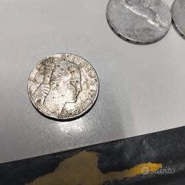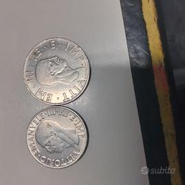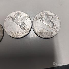 Vendo in blocco o singole 5 monete. Due lire e Una lira del 1939 molto belle con aquila e littorio. Due monete da 10 lire del 1949 e 1950 Una moneta da 5 lire del 1949 con uva