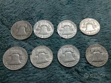 belle monete d'argento 900 franklin degli stati uniti d'america sono state realizzate in argento 900 per un peso di 12,5 grammi cada una il prezzo si intende per l'intero lotto di 8 monete anni 1948,1951,1952,1958,1963x4 totale 8 monete