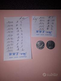 MONETE da 10 LIRE N. 54 DAL 1972 AL 95 (vedi foto) + monete da 20 lire n. 54 dal 1957 al 1991 + 20 lire speciali (vedi foto) tutte a €. 120,00