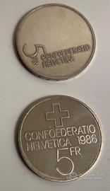 2 monete Franchi Svizzeri 5 franchi - 1985 Moneta Commemorativa Battaglia di Sempach - 1986 Moneta Confoederatio Helvatia