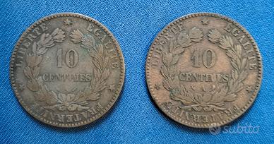 Due monete Francia da 10 centimes della Terza Repubblica (tipo “Cérès”), anni 1883 e 1897 in bronzo. Circolate.