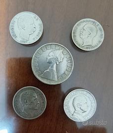 Vendo 5 monete in argento 835. 1 lira 1887 Umberto I peso 5 grammi 1 lira 1907 Vitt Eman III peso 5 grammi 1 lira 1910Vitt Eman III Peso 5 grammi 5 lire 1927 Vitt Eman III peso 5 grammi 500 lire caravelle 1964 peso 11 grammi Autentiche e ben conservate.