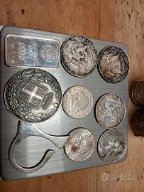 cedo lotto composto da 100 monete da 500 lire in Argento più 100 grammi di Argento come da foto, interessante e raro il portachiavi ricavato dal 5 lire chiaramente tutto in Argento, non spedisco solo consegna a mano a Torino .