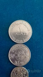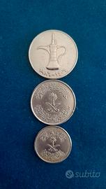 Lotto di 3 monete dei Paesi arabi. 1 da 1 Dirham degli Emirati arabi e due da 10 e 50 Halala dell'Arabia Saudita. In ottime condizioni .
