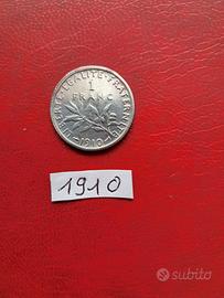 Francia 2 vecchie monete d'argento da 1 franco una del 1905 BB e l'altra del 1910 SPL condizioni ottime come da foto
