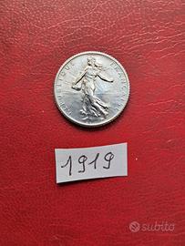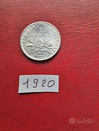 Francia 2 vecchie monete d'argento da 1 franco del 1919 e 1920 condizioni FDC come da foto