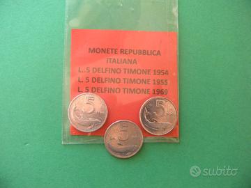 Picclo lotto monete della prima Repubblica Italiana , lire 5 delfino / timone ; anni 1954 -1955 - 1969 - Monete in ottime condizioni di conservazione -
