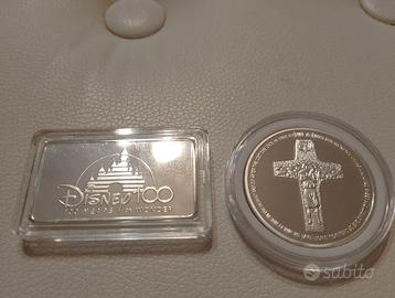 -Disney 100 che commemora i 100 anni dalla nascita della Disney,placcata color argento,rettangolare,con l'immagine colorata di Mickey Mouse (Topolino),in capsula. La capsula ha un punto danneggiato,poco visibile.Grande circa 2,8 cm x 5 cm.
