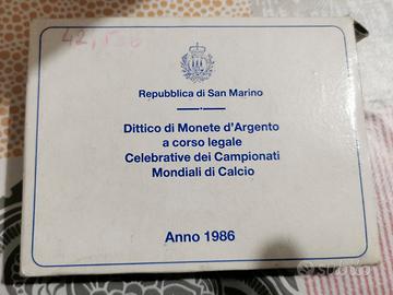 Vendo ditico ufficiale della Repubblica di San Marino – anno 1986, composto da due monete d’argento a corso legale, emesse per celebrare i Campionati Mondiali di Calcio.