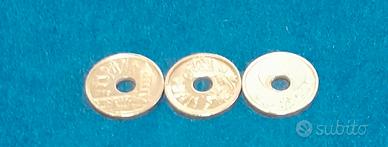Lotto di tre monete spagnole da 25 centesimi col buco. Tutte e tre diverse. Difficili da reperire. Lucenti e in ottime condizioni. Per collezionisti!