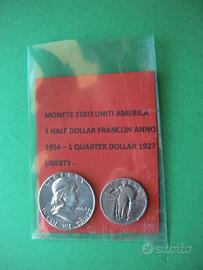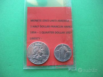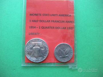2 Monete degli Stati Uniti America : half-dollar Franchlin anno 1954 - Querter dollar '' Liberty '' 1927 - ottimo lo stato di conservazione -