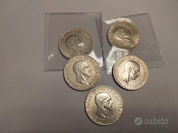 Nr. 5 monete argento Vittorio Emanuele Terzo.10 lire Italia su prora. condizioni ottime.