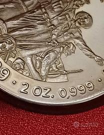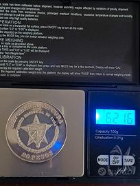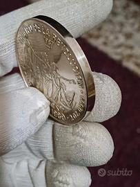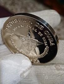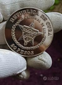 Rarissima moneta cubana da 2 once in argento puro, con una tiratura ultra-limitata di soli 500 esemplari in tutto il mondo nel anno 1987. Data sotto la chiave valore nominale 20 pesos. Moneta estremamente rara Sempre più rara e ambita. Anno 1987 da non confondersi con l'anno 1988 che a il tiraggio piu alto