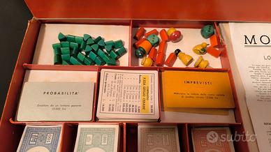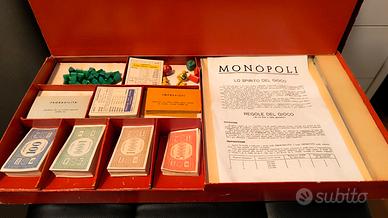 Monopoli vintage – prima edizione italiana con scatola originale rossa (scritta “MONOPOLI” + “BREVETTATO”).