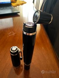 Stilografica Montblanc Boheme con pennino retrattile platinato in oro 14 ct., serbatoio e cappuccio in pregiata resina nera con stella bianca Montblanc intarsiata, anelli platinati e clip con onice nera incastonato.