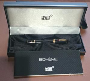 Montblanc Boheme Rouge penna stilografica, pennino retrattile in oro 14 KT lavorato a mano con inserto finitura rodio, finiture laminate oro, gemma color rubino sulla clip. Stella bianca Montblanc intarsiata sul cappuccio. Stilografica con doppio sistema di caricamento, cartuccia (standard) o converter (permette l’utilizzo opzionale di caricare la penna nella bottiglia d’inchiostro). Lunghezza 12,3 cm. Larghezza 1,3 cm. Con scatola originale. Listino 715 euro. NUOVA