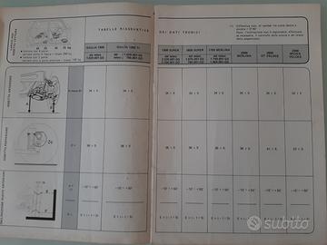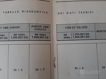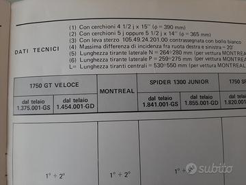 ALFA ROMEO MONTREAL / GIULIA /1750/2000 E DERIVATE istruzioni per le riparazioni RUOTE E SOSPENSIONI-ASSETTO ED ANGOLI CARATTERISTICI DELL'AVANTRENO-TABELLE RIASSUNTIVE DEI DATI TECNICI PROVENIENTE DA OFFICINA AUTORIZZATA anno pubblicazione N. 1836/R1 gennaio 1972 condizioni ORIGINALI tutte le pagine presenti vendesi nello stato in cui si trova euro 50 piu eventuali spese di spedizione visibile e ritirabile prov. BOLOGNA per ulteriori info tel 3387789693 PER ALTRO MATERIALE ALFA ROMEO/FIAT/LANCIA/AUTOBIANCHI /PORSCHE TELEFONARE grazie
