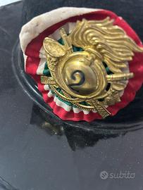 Originale Moretto da Bersagliere – Secondo Regime, copricapo storico di grande fascino e interesse collezionistico. Realizzato con cupola in feltro nero e ampia tesa rigida lucida, è impreziosito frontalmente da fregio metallico dorato con numero “2” montato su coccarda tricolore in tessuto, dettaglio distintivo che ne valorizza l’estetica e il richiamo storico.