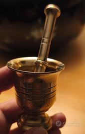 antico piccolo mortaio in ottone con pestello, altezza cm 5, peso gr.100.usato anticamente nelle farmacie ed erboristerie. Per amatori collezionisti