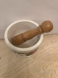 Mortaio in ceramica bianca con decoro mele rosso scuro e foglie verdi