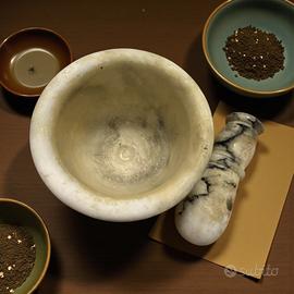 Piccolo ma possente, scolpito nella pietra ollare e impreziosito dal volto di uno spirito protettore, questo mortaio cinese porta con sé l’eredità dei rimedi di un tempo. Veniva usato nelle case e nei templi per preparare medicamenti e polveri officinali, ottenuti pestando radici, cortecce e resine aromatiche. Ogni movimento del pestello liberava profumi di terra e di erbe, in un gesto lento, rituale, quasi sacro. Il volto scolpito — con gli occhi socchiusi e la bocca che accenna un sorriso sereno — vegliava sul rito della cura, simbolo di equilibrio tra corpo e spirito. Oggi, la sua materia calda e porosa conserva la traccia di quei gesti antichi, offrendo una presenza potente e silenziosa: un frammento di medicina e spiritualità orientale da custodire o donare.