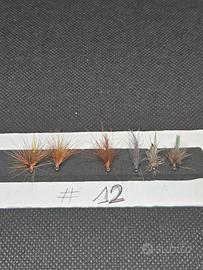 12 mosche secche senza ardiglione, costruite artigianalmente. 9 su amo del 12 e 3 su amo del 10. su richiesta possibilità di averne altre.