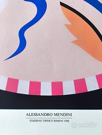 Manifesto originale realizzato nel 1988 e pubblicato da Edizioni Tiperti di Rimini, dedicato ad Alessandro Mendini. L’immagine presenta una composizione circolare di forte impatto visivo, inserita su fondo scuro, nella quale elementi astratti, forme biomorfe e segni grafici convivono in un equilibrio giocoso e sofisticato.