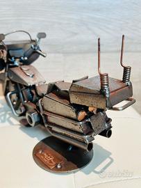 Modellino di motocicletta artigianale realizzato interamente in metallo riciclato, frutto di un’attenta lavorazione manuale che rende ogni pezzo unico e non replicabile.