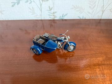 Vendo affascinante modello decorativo in metallo raffigurante una moto d’epoca con sidecar, in colorazione blu intenso.