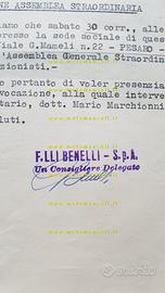 Raro documento originale redatto su carta intestata Fratelli Benelli Costruzioni Meccaniche Pesaro, e con firma autografa di Giovanni Benelli, uno dei fratelli Benelli e Presidente della società.