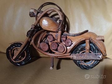 Moto artigianale in legno, modellata per somigliare a una moto Harley-Davidson. È realizzata interamente in legno naturale, inclusi rami e pezzi di corteccia, come ruote, motore stilizzato e manubrio realizzati con sezioni e rami di legno.