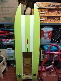 catamarano radiocomandato di 1,40 MT in legno e fibra di vetro in buone condizioni senza motorizzazione ed elettronica. molto veloce e stabile. Modello esteticamente molto bello e robustissimo. motorizzabile sia a scoppio con un 26/30 cc o elettrico con motori da 56.