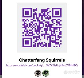 Mazzo di Magic The Gathering formato Commander con comandante Chatterfang Squirrel General, colori Nero e Verde, tribale Scoiattoli. Per consultare la lista usare il QR code in foto sleeves inviate non saranno quelle in foto